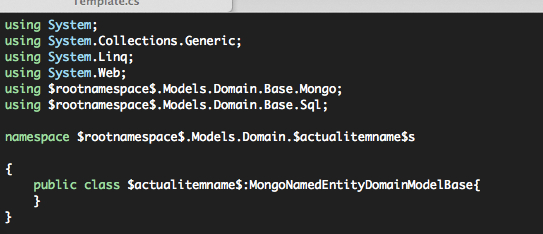 $rootnamespace$ – This is a visual studio defined placeholder which will output the default namespace defined at project level. If you then, as we do here, bury the objects deeper in your project structure you will need to reflect the rest of the namespace later.