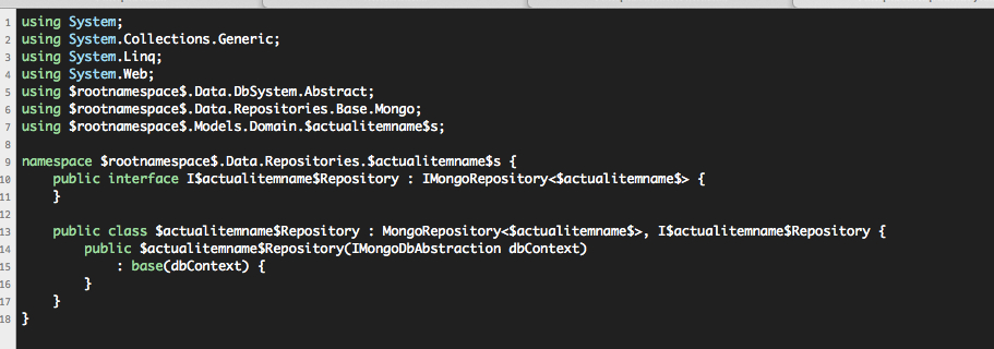 We should use the ‘TemplateRepository.cs’ file as our template. Note that if you were to try using $itemname$ within the TemplateRepository template the value in this instance would be ‘ContactsRepository’ not ‘Contact’ that we get by using $actualitemname$