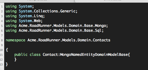 So using our ‘Contact’ example against a project namespace of ‘Acme.Roadrunner’ our Contact Entity would be generated thus:-
