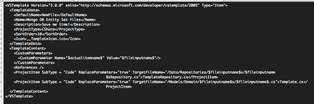 A couple of things to note here, any visual studio placeholders are defined inside $ signs like for instance $rootnamespace$. As you can see the following placeholders are used in this template, our Entity template:-