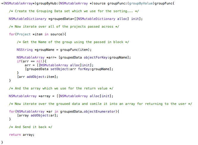 OK so line by line as you can see we have defined a function called ‘groupByHub’ which returns an NSMutableArray object. This in turn will contain NSMutableArrays containing projects grouped by the selected category. More on that later… The function takes two arguments:-