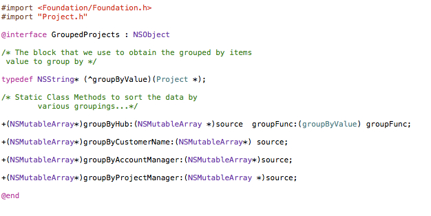 We only really need to examine the code for our GroupByCustomerName function to see what is going on here. We start off by by defining the implementation of our block. The type name ‘groupByValue’ matches our typedef from the .h file as does the signature. The only real difference is that is this is an implementation we use a variable to refer to the block later in code. In this instance we use the variable name ‘gp’. The code within the block is extremely simple, given a project that is passed in we return the value of this group, in this instance ‘Customer Name’ but in other instances we also return ‘Project Manager’ and ‘Account Manager’.