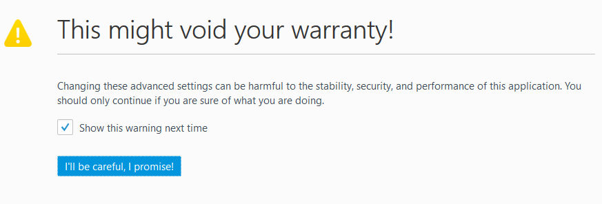 - Enter the URL about:config into your browser window. You will be presented with the following:-