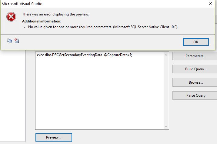 The stored procedure itself was called DSCGetSecondaryEventingData and had one parameter called @CaptureDate; this was defined in the stored procedure as a date time because, well… I’m not a monster. Thats what you do. So, as you would do I defined the OleDbsource like this:-